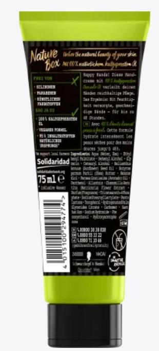 Nature Box Handcreme mit kaltgepresstem Avocado-Öl bietet intensive Pflege und Feuchtigkeit für trockene Hände. Die reichhaltige Formel zieht schnell ein und hinterlässt die Haut geschmeidig und weich, ohne einen fettigen Film zu hinterlassen. Die Handcreme ist ideal für die tägliche Anwendung und schützt die Haut vor dem Austrocknen.
