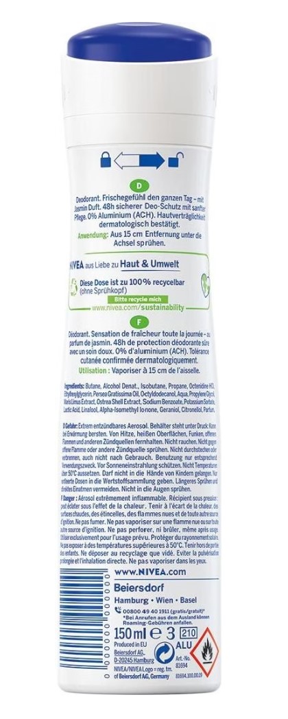 Nivea Deo Fresh Pure Jasminduft Spray bietet einen langanhaltenden, frischen Duft mit einer blumigen Jasminnote. Es sorgt für ein angenehmes Frischegefühl und zuverlässigen Schutz vor Körpergeruch. Die Formel ist sanft zur Haut und enthält keine Aluminiumsalze, was sie besonders hautverträglich macht.