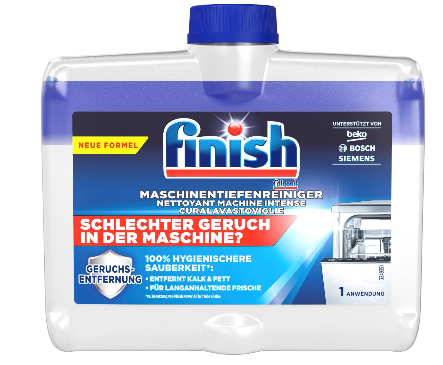 Finish Maschinentiefenreiniger 250ml ist ein spezielles Reinigungsmittel, das entwickelt wurde, um Geschirrspülmaschinen gründlich zu reinigen und von Fett, Kalk und anderen Ablagerungen zu befreien. Durch regelmäßige Anwendung wird die Leistung der Spülmaschine optimiert und unangenehme Gerüche werden beseitigt. Der Reiniger sorgt dafür, dass die Maschine hygienisch sauber bleibt und die Lebensdauer verlängert wird.