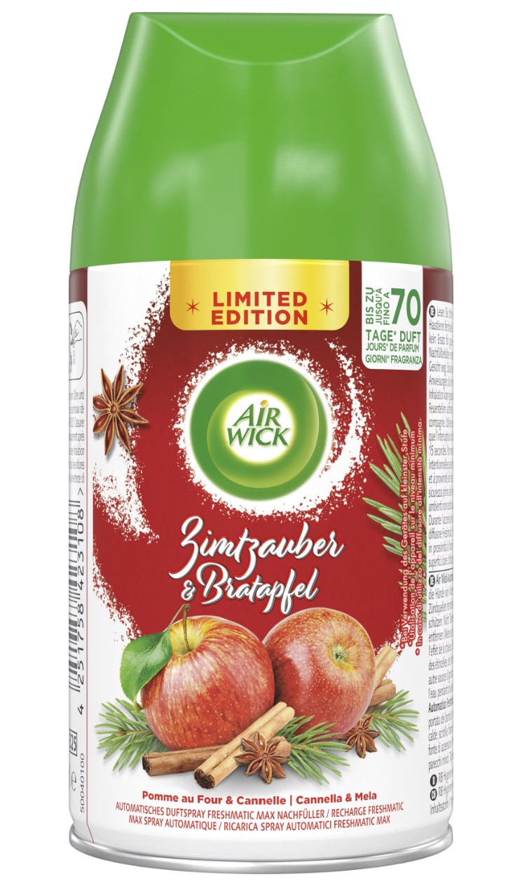 Air Wick Freshmatic Max Nachfüller Zimtzauber & Bratapfel bietet eine einladende und gemütliche Atmosphäre mit seinem warmen Duft von Zimt und gebratenem Apfel. Dieser Nachfüller ist speziell für den Air Wick Freshmatic Max entwickelt und sorgt für kontinuierliche Frische in Ihrem Zuhause. Mit einer Füllmenge von 250 ml bietet er langanhaltenden Duft, der sich ideal für die Herbst- und Wintermonate eignet.