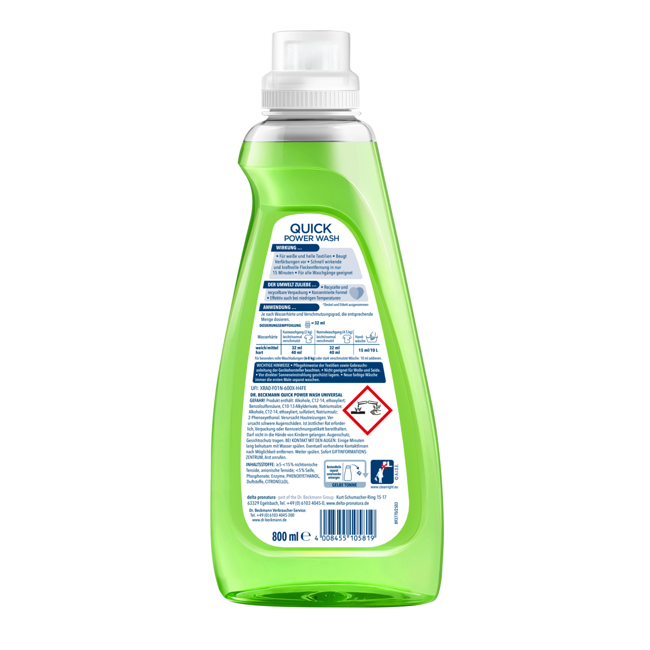 Das Dr. Beckmann Universal Quick Power Wash sorgt für kraftvolle Reinigung und strahlend saubere Wäsche – auch bei kurzen Waschprogrammen. Die effektive Formel entfernt zuverlässig Schmutz und alltägliche Flecken und ist bereits bei niedrigen Temperaturen wirksam.